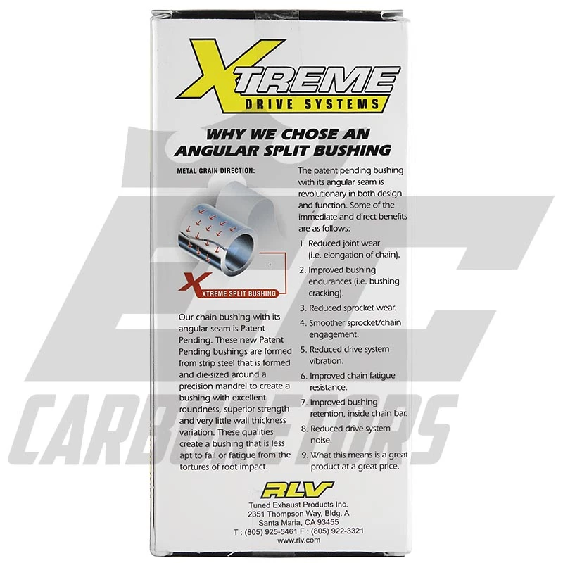This increased acceleration is not at the expense of strength. The tinsel strength of the chain is more than 2,300 P.S.I. XTREME chain is pre-lubricated and pre-stretched, which reduces the need for adjustment. Xtreme chain is free rolling with less drag due to the unique spacing and clearance between bushing, pin, and sidebar, known as the “space chain.” The sidebars are plated to reduce the distribution of oxidized and corrosive particles that may become trapped between the bushing and the pin, causing kinking and premature chain failure. Master link included- Part Number 0852 for Gold on Black.